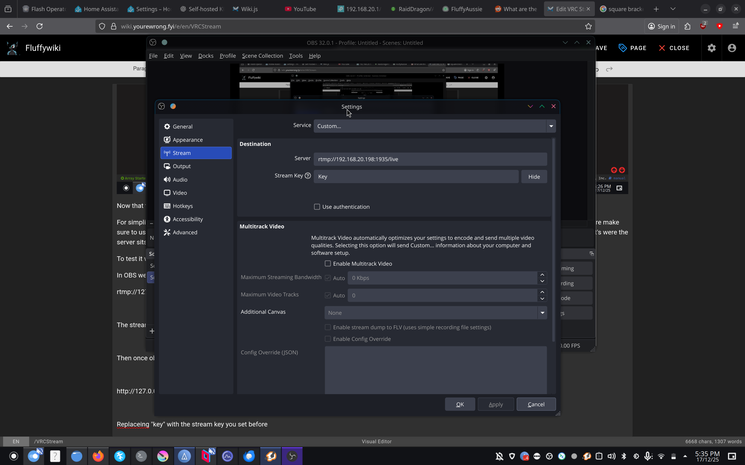 In OBS we want to update our setting to stream to our server, To do this we need to go to custom the enter our server as the server to stream to with the following