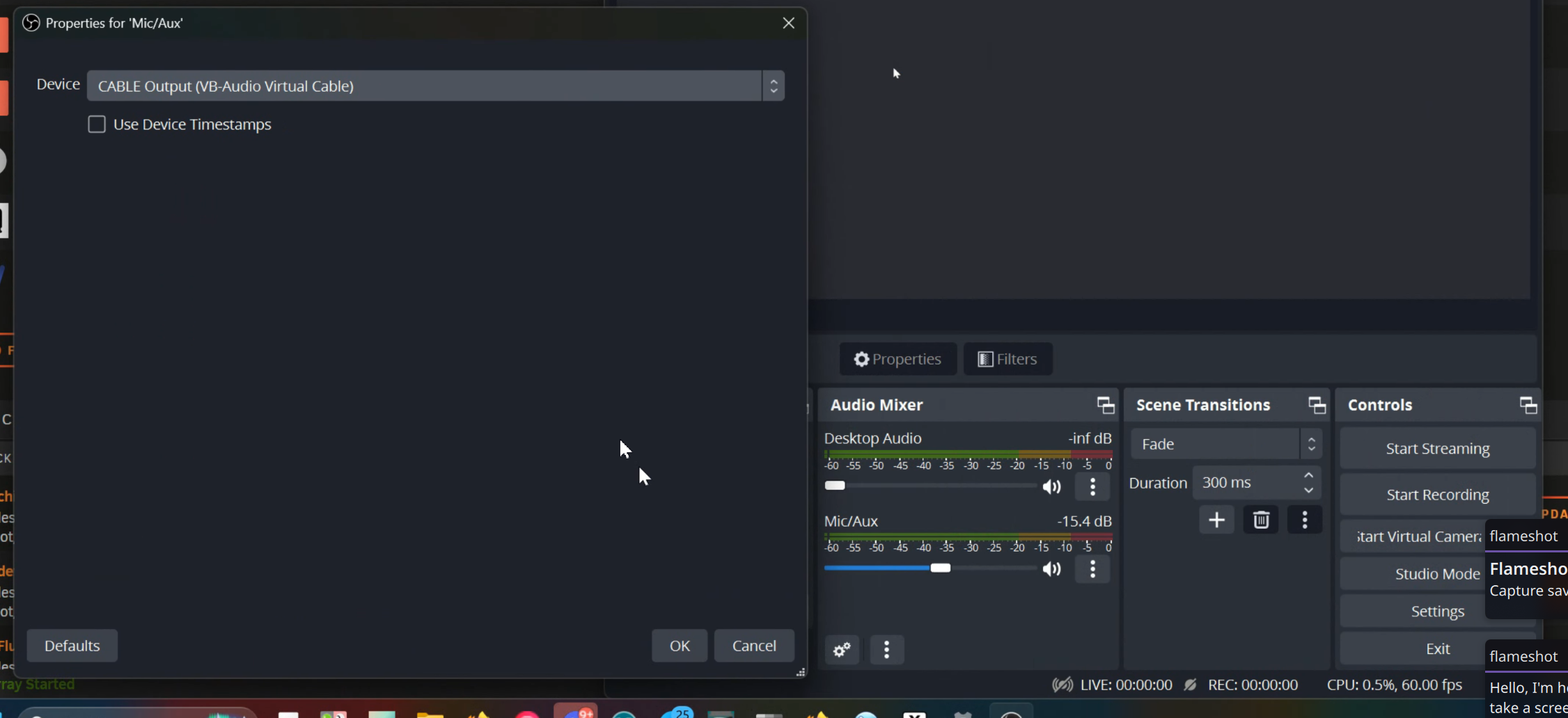 Also pro tip in the obs audio devices, mute your mic, and also make sure its not picking up all your desktop audio so voices are not duplicated, And because we are using a Virtual cable, its mapped to a “mic” we can just use this as the audio for obs (otherwise obs does now have a application only audio capture option that will also work)