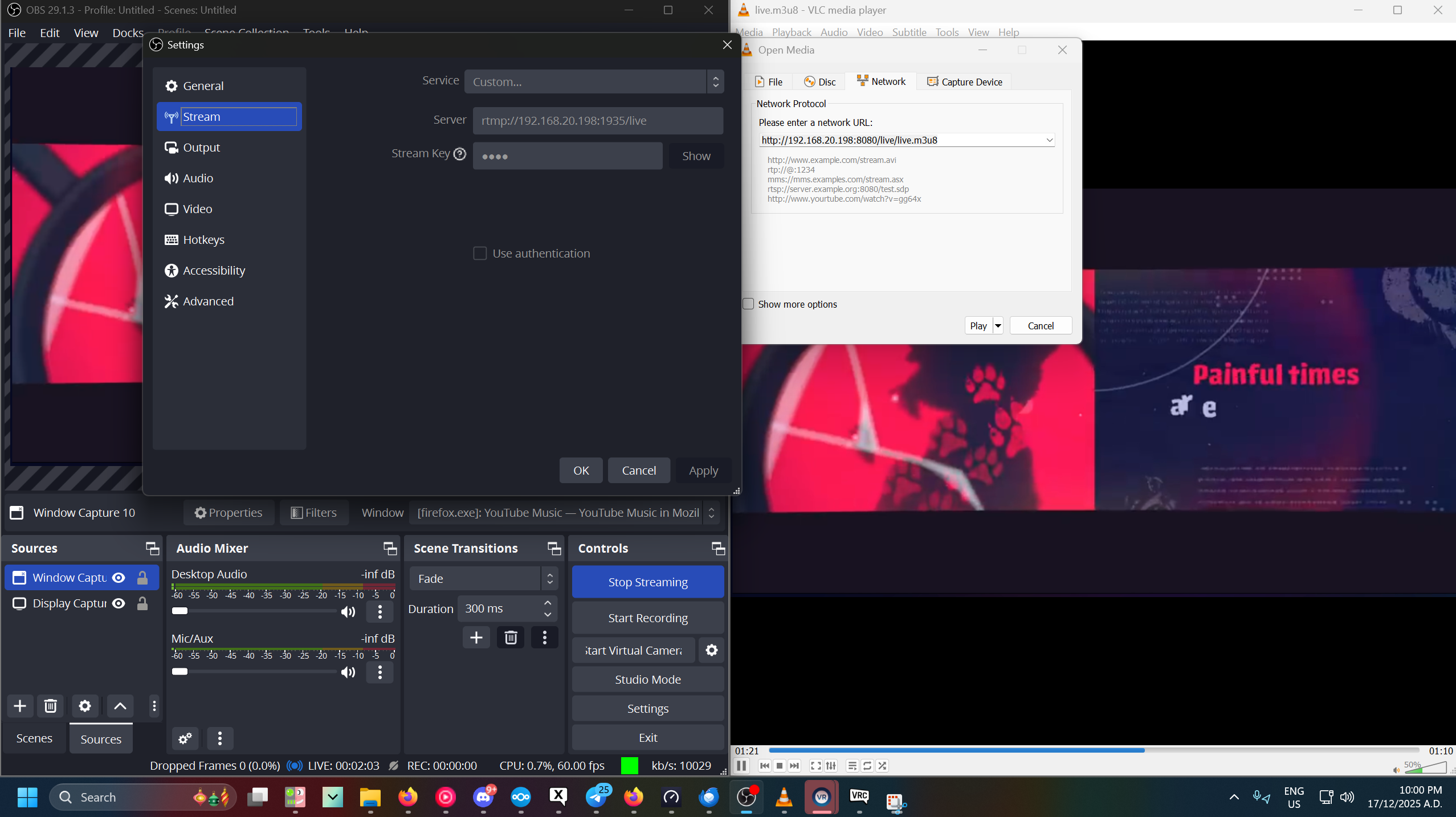 Some things i would like to mention regarding this setup is there is no security to who can view the stream. Anyone who knows the URL you are streaming to can see What ever you are streaming. You should also be safe with what you stream to begin with, You likely don't want everyone in VRC to see info you might have on your computer, like a work email or your password, This can best be solved by using obs window capture rather then your whole desktop, if you are not using a dedicated system. And always assume someone is watching if obs is streaming to the server itself it will be publicly available.