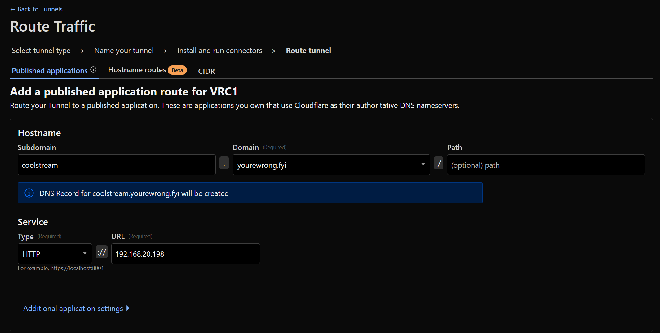 Then in the tunnel we need to make it “cloudflared” and set a internal name
