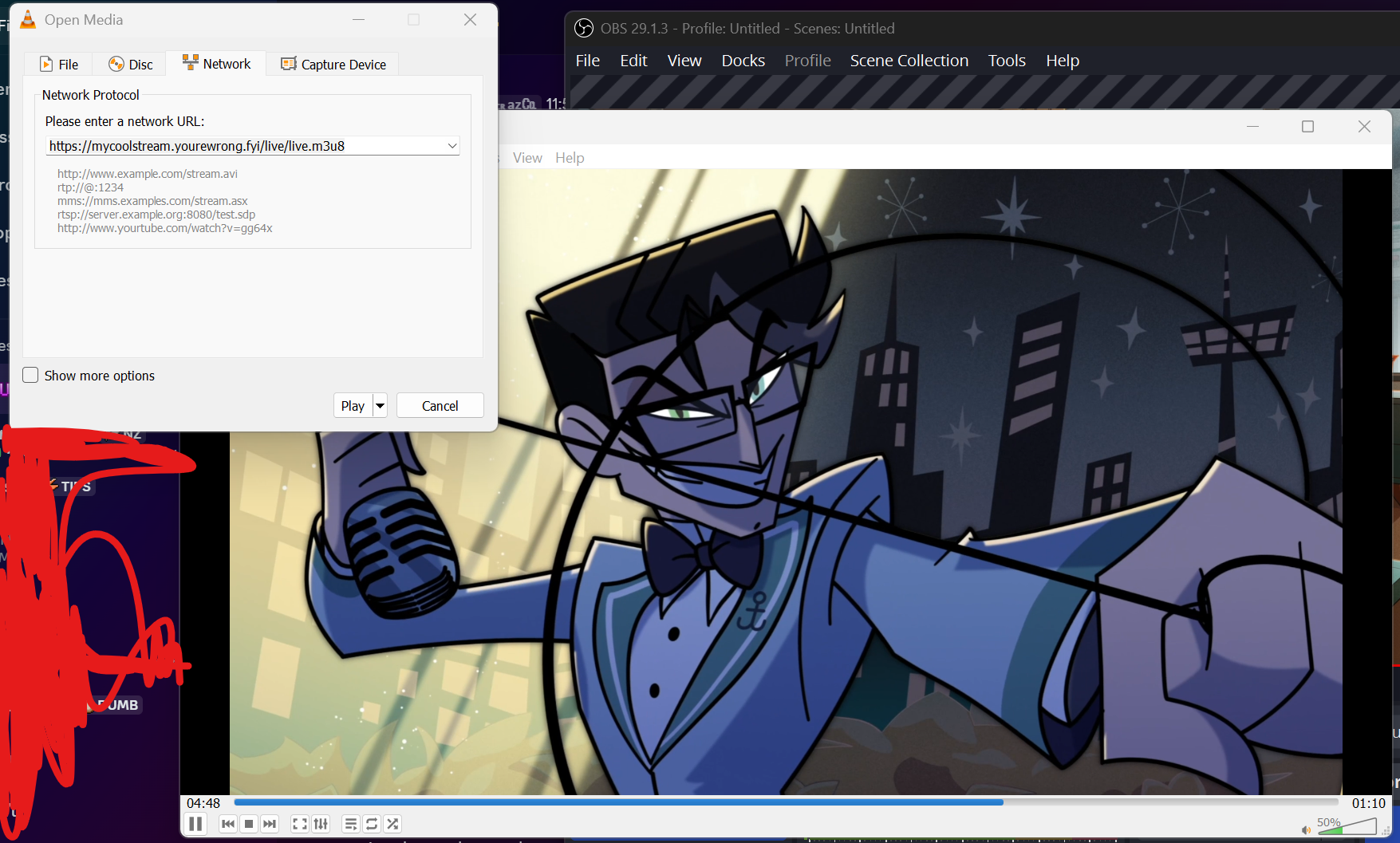 Then once obs is streaming in vlc open up the stream, you can do so using this URL in VLC